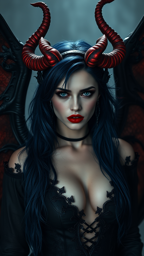 A stunning queen vampiress with luminous, alabaster skin exudes confidence and power. Her lips are painted a deep, seductive red, contrasting beautifully with her cascading, dark blue hair. Her piercing crimson eyes captivate all who fall under her gaze. Regal, with brilliant jet-red horns and an impressive set of six arching wings, she commands the respect and admiration of her fellow vampires, who bow in reverence. The scene is dark and morbidly gothic, enveloped in a dense, wet atmosphere that feels both epic and dramatic. Sweat adorns her flawless skin, adding a touch of realism to this hyperornate vision. She's a femme fatale in a glamour shot, filled with passion and intensity. The background is incredibly detailed, showcasing a maximum landscape that immerses the viewer. Photorealistic and rendered with stunning clarity, the volumetric lighting highlights every aspect of this hypermaximalist scene, captured in a full body shot that feels alive with emotion and depth, as if created in Unreal Engine 5.