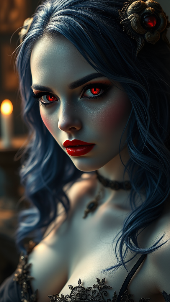 A stunning queen vampiress with porcelain white skin, midnight blue hair cascading in waves, and piercing crimson red eyes that captivate and allure. Embodying the essence of a charmer, she exudes a dark, morbid elegance synonymous with gothic beauty. Her presence is wet and atmospheric, shrouded in an epic, dramatic aura. Sweat glistens on her skin, adding a touch of realism to the creepy yet ornate setting. As a quintessential femme fatale, she exudes glamour and passionate intensity, captured in a highly detailed, photorealistic full body shot. Surrounded by a rich, maximum-detail landscape, the scene is rendered with octane precision, utilizing volumetric lighting to enhance the dense, captivating environment.