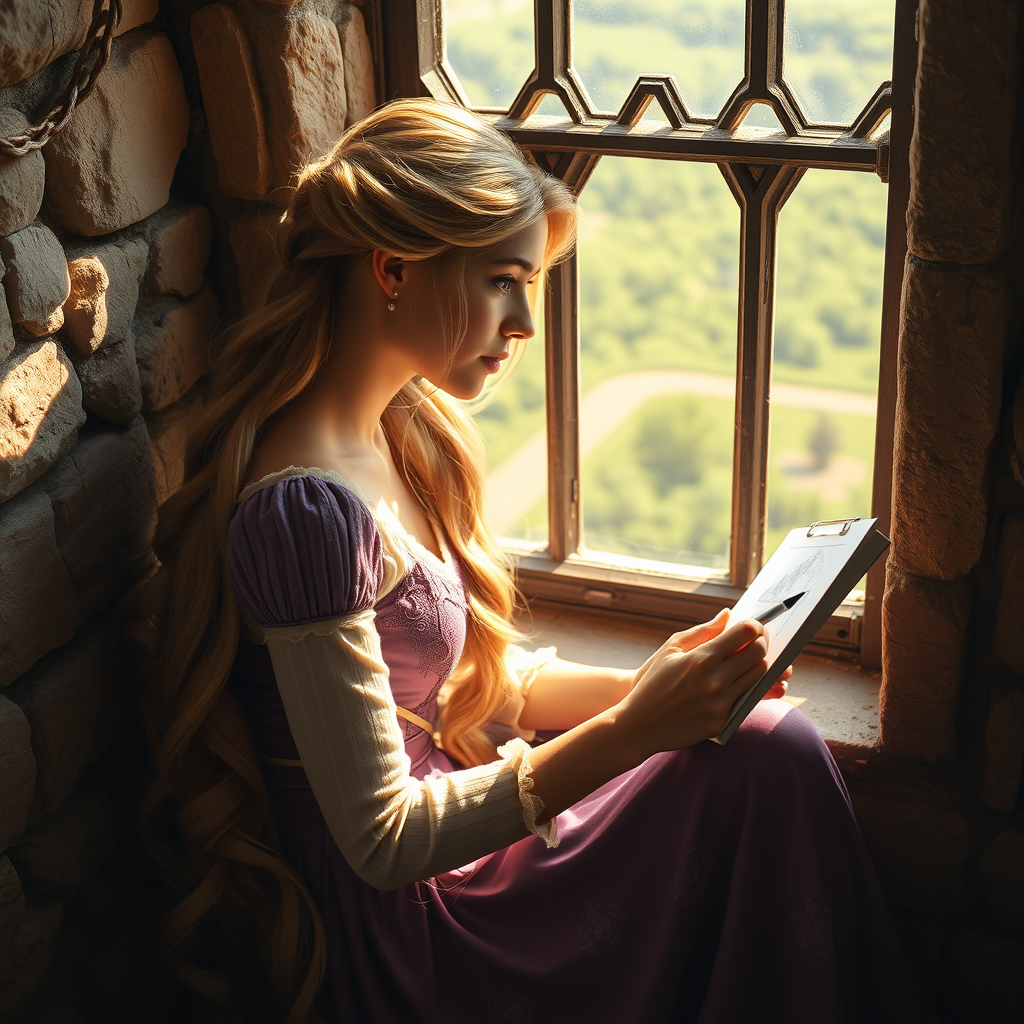 A stunning real-life version of Rapunzel from Tangled sits gracefully in her tower, her golden braid cascading down her back as she sketches the world outside her window with meticulous detail. The scene is captured in ultra-realistic 8k, with the warm glow of natural sunlight streaming in, illuminating her delicate features and casting soft shadows across the room. The composition is a masterpiece of photorealism, with an epic sense of depth and vibrant color, as the subtle textures of the stone walls and the lush greenery beyond the window come to life in breathtaking clarity.