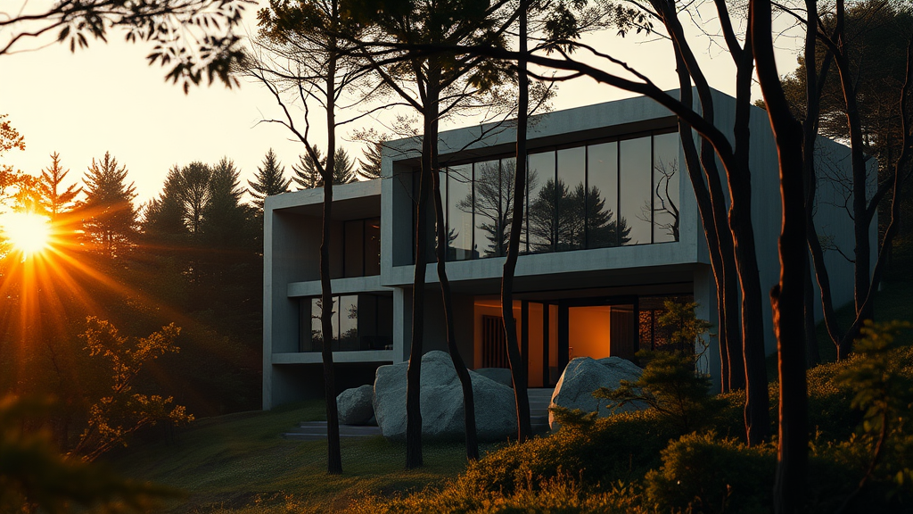 A stunning realistic image of a brutalist-style house with expansive glass walls, nestled within a dense forest at dusk. The house features bold geometric shapes and raw concrete structures, capturing the essence of brutalist architecture. The setting sun bathes the scene in a warm, golden light, accentuating the interplay between the structure's sharp lines and the forest's organic forms. In the foreground, soft silhouettes of trees subtly frame the house, creating a harmonious blend of natural and architectural beauty. A few large boulders near the entrance add an element of rugged charm to the modern landscape, while subtle reflections on the glass highlight the dynamic interaction between the interior space and the surrounding wilderness.