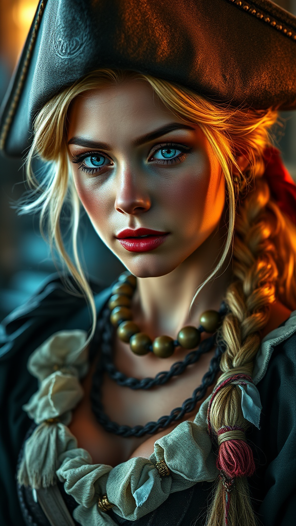 A stunning realistic portrait of a beautiful 20-year-old woman with blonde hair dressed as a pirate captain. Her attire is intricate and elaborately detailed, capturing the essence of hyper-realism. The composition includes her full character in view, showcasing her flawless anatomy and beautifully detailed face. She has random colored strands in her hair and strikingly unique mercury-colored eyes, adding a captivating twist to her appearance. The scene incorporates bar lighting, creating dynamic shadows and highlights that enhance the luminism and gritty, realistic color scheme. The image is a digital masterpiece, with intense coloration and intricate details that contribute to an award-winning quality. The composition is a hyper-detailed, full-color, UHD, HDR painting, capturing the essence of fantasy with sharp focus and a perfect blend of realism and creativity.