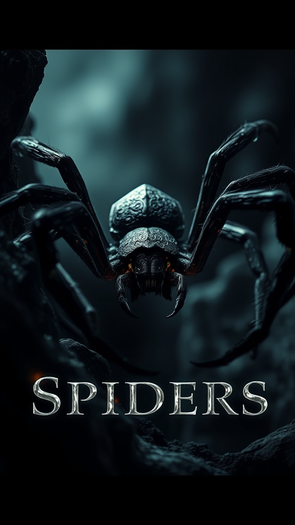 A stunning, realistic portrayal of a spider set against an epic fantasy backdrop, featuring intricate details and dramatic lighting that highlights its form. The scene is captured with dark tones and enhanced with visual effects that give it a high dynamic range. The spider is depicted in such detail that it appears as if it's emerging from the edge of the frame. The composition is complete with a subtle, ethereal title hovering nearby, seamlessly blended into the background, free of any text or watermarks.