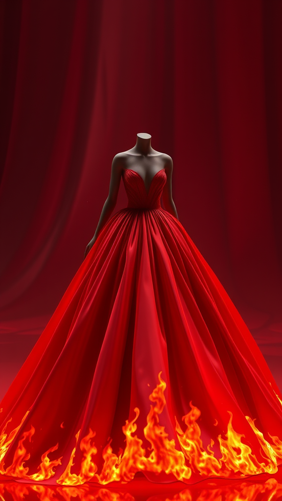 A stunning red ball gown, ablaze at the hem with vivid flames, perfectly crimson in hue, full-length with an expansive silhouette, portrayed in a highly detailed and captivating manner. Concept art style suitable for Artstation, utilizing Octane render for cinematic illumination, exuding an otherworldly charm. Captured in 8K, the image emphasizes the dress's dramatic flair and fiery essence.