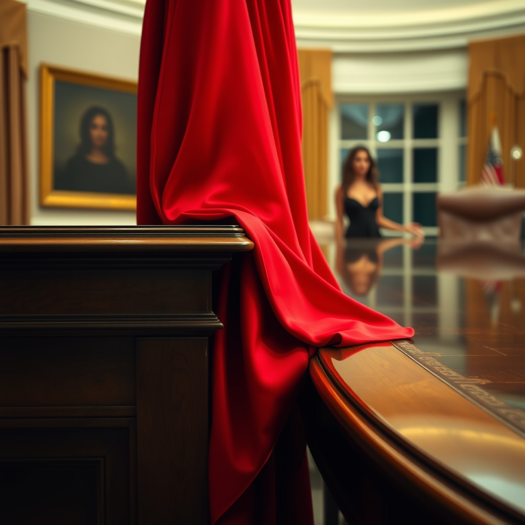 A stunning red dress elegantly draped over the corner of a polished wooden desk in the White House Oval Office, captured in soft focus with an f2.8 aperture. The ambient light highlights the intricate details of the room's classic decor. With a subtle presence of a woman just out of frame, the scene feels both intimate and powerful, embodying a blend of mystery and allure.