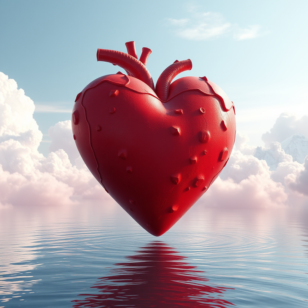 A stunning red heart floating majestically amidst the clouds over a tranquil body of water, evoking the intricate detailing of ZBrush, bathed in serene light pink and sky-blue hues. The scene is so breathtakingly beautiful, it's almost beyond belief, reminiscent of hyperbolic expressions in NYC explosion coverage. Rendered in Unreal Engine 5 with a touch of Robert Bissell's whimsical charm, the atmosphere is both surreal and captivating, creating a dreamlike vision with a distinctive artistic flair.