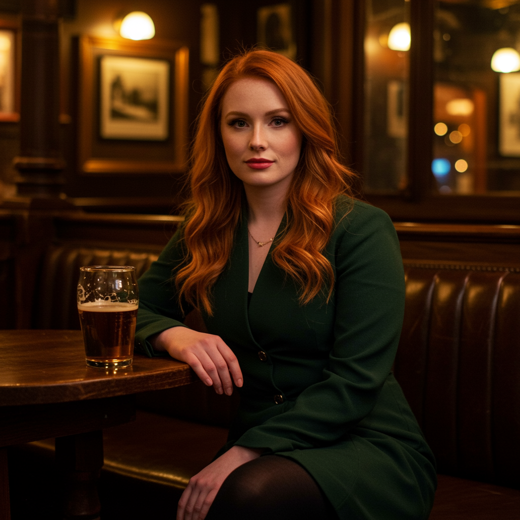 A stunning redhead Irish woman sits in an authentic pub, bathed in warm, ambient light. The scene is captured with a vintage, cinematic touch reminiscent of Velvia film, offering vibrant colors and crisp detail. Photographed with a sophisticated large-format 65mm lens, the image boasts 16 megapixels and 8k resolution, delivering a lifelike, immersive experience. She exudes elegance and charm, with a mesmerizing gaze that draws viewers into the lively, atmospheric backdrop of the pub. The composition follows an aspect ratio of 2:3, bringing harmony to this photorealistic portrayal.