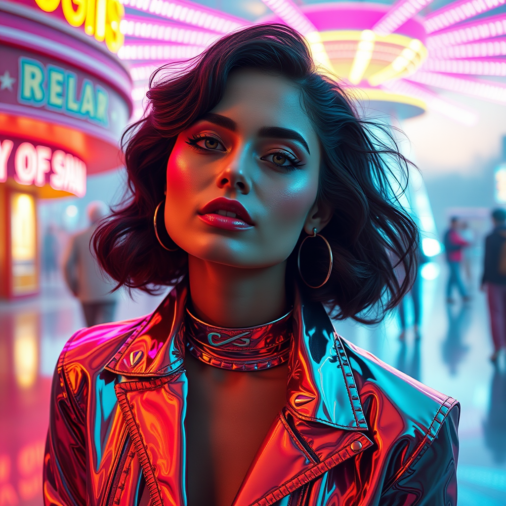 A stunning retrofuturistic portrait of a woman set in the vibrant world circus, captured in hyperrealistic detail with octane render and CGI precision. The image embodies the vivid hues of ProPhoto RGB, enhanced by a surreal engine for a dreamlike quality. Photographed in 35mm for Ultra HD clarity, this masterpiece resembles a Marc Jacobs fashion magazine shoot, showcasing futuristic fashion elements. Her face, among the most beautiful in the world, exudes an ethereal allure as she strikes a confident pose in a striking chrome outfit. The background features a surreal landscape, blending nostalgia with modernity by evoking a 90's fashion style. Captured in medium format, this artwork channels the essence of Fuji Superia 400 film at ISO 400, lending a cinematic and surrealistic aesthetic to the scene, presented in breathtaking 8k resolution.