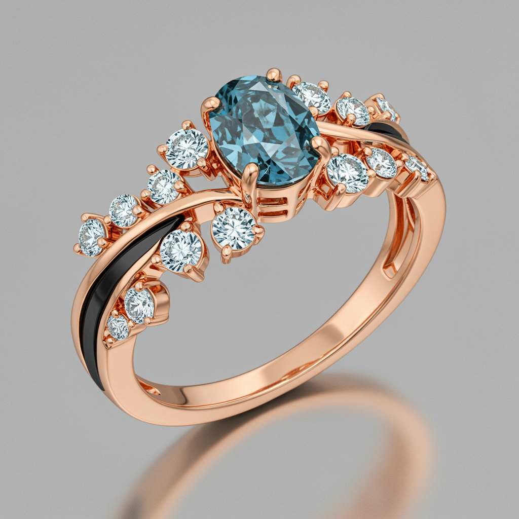 A stunning ring featuring radiant rose-cut blue diamonds at its heart, encircled by delicate lily-of-the-valley flower-shaped white diamonds, with elegant golden stems weaving together to form the band. The centerpiece rests on a lustrous base of rose gold, complemented by sleek, detachable black bands on either side, creating a harmonious blend of opulence and sophistication.