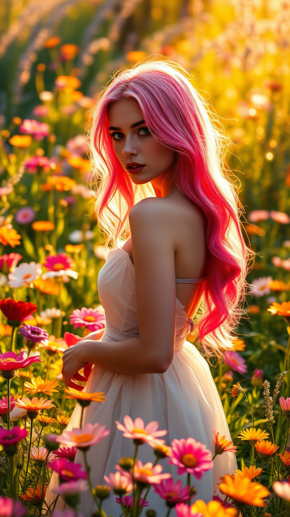 A stunning Russian model with vibrant synthwave-style pink hair stands gracefully in a colorful meadow brimming with an array of exquisite flowers, each petal catching the golden shimmer of sunlight. The light dances across a macro lens, creating a kaleidoscope of intricate glitters that illuminate the scene. The artwork possesses insane and intricate detail, infusing elements of Hearthstone game style combined with influences from Ivan Fomin, Anton Zemskov, and Mike Sass. A hyper-realistic painting effect accentuates the lifelike quality, enriched by the magical touch of Stanley Artgerm, Tom Bagshaw, Greg Rutkowski, Carne Griffiths, Ayami Kojima, and WLOP. Crafted in epic 8K resolution, the image features sharp cinematic focus, creating a fantasy world with a beautiful interplay of ambient lighting. Rich, vivid colors and a glowing lens flare enhance the captivating scenery, presenting an anime key visual and concept art blend that evokes a dreamlike wonder.