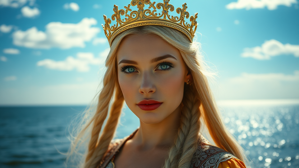 A stunning Russian princess graces the shoreline, crowned with gold and adorned in intricate Russian cultural attire. Her long, flowing blonde hair is woven into captivating braids, complementing her mesmerizing gaze and enchanting expression. The vivid blue sky, speckled with clouds, serves as a breathtaking backdrop, meeting the shimmering body of water. This cinematic moment, reminiscent of an 1980s film, is captured with the richness of Kodak Portra 800. Her symmetrical face radiates detail and realism, caught in radiant light rays that filter through a gentle mist. With extreme attention to detail, her skin, eyes, and attire are ultra-realistic; each feature finely rendered as if in a high-resolution digital painting, blending analog style with modern techniques. This art piece is a harmonious synthesis of realism and imagination, showcasing detailed textures and natural shadows. The scene is alive with a magical ambiance, touched by light beams and ambient occlusion, completed with an ethereal whisper of moonlight, embodying an overall tone of wonder and elegance.