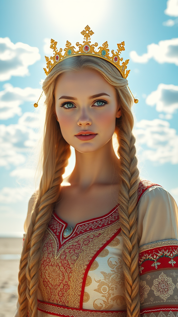 A stunning Russian princess with long braided blonde hair and a golden crown, dressed in an exquisite Russian cultural gown, strolls along a beach under a vibrant blue sky dotted with fluffy clouds. Her captivating gaze and alluring expression are flawlessly caught as if from an iconic cinematic film still of the 1980s, reminiscent of Kodak Portra 800 film. The scene is ultra-realistic, with the princess's detailed eyes and skin reflecting the meticulous artistry associated with digital painting and 3D rendering. The landscape is perfectly symmetrical, with the radiant sun casting magical light beams through a gentle mist, creating a heavenly and almost ethereal atmosphere. Soft ambient light highlights her intricate dress. The beach setting features a serene body of water in the background, and the light aesthetic gives off a misty, dreamy quality. Enhanced by elements such as sharp focus, precise shadows, and natural skin texture, the image captures the essence of realism and photorealism characteristics. The harmony of this scene is complemented by expertly applied tone mapping and ambient occlusion, embodying a masterful blend of digital art techniques for a high-detail, mesmerizing piece.