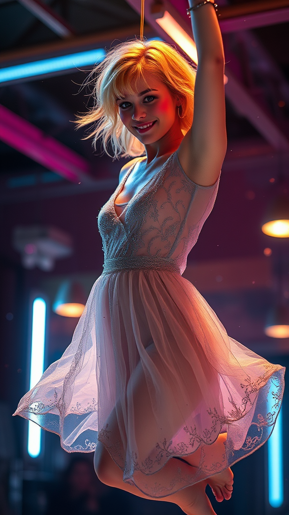 A stunning scene captures a blonde woman gently suspended in the air, her short messy hair catching the light as she gracefully moves. Adorned in a transparent silver lace dress that flutters with the slightest breeze, her delicate frame is highlighted. A soft smile graces her face, adding to her ethereal beauty. The studio lighting casts a warm glow, enhanced by the bokeh effect and a subtle fog that creates a dreamlike halo around her. Neon lights in the background add a vibrant contrast, reflecting off luminescent particles that seem to dance in the air. Captured in a cinematic angle with perfect anatomy and realistic details, the image is a high-resolution masterpiece in 32k UHD, showcasing the best quality of professional photography with a touch of artistic flair.