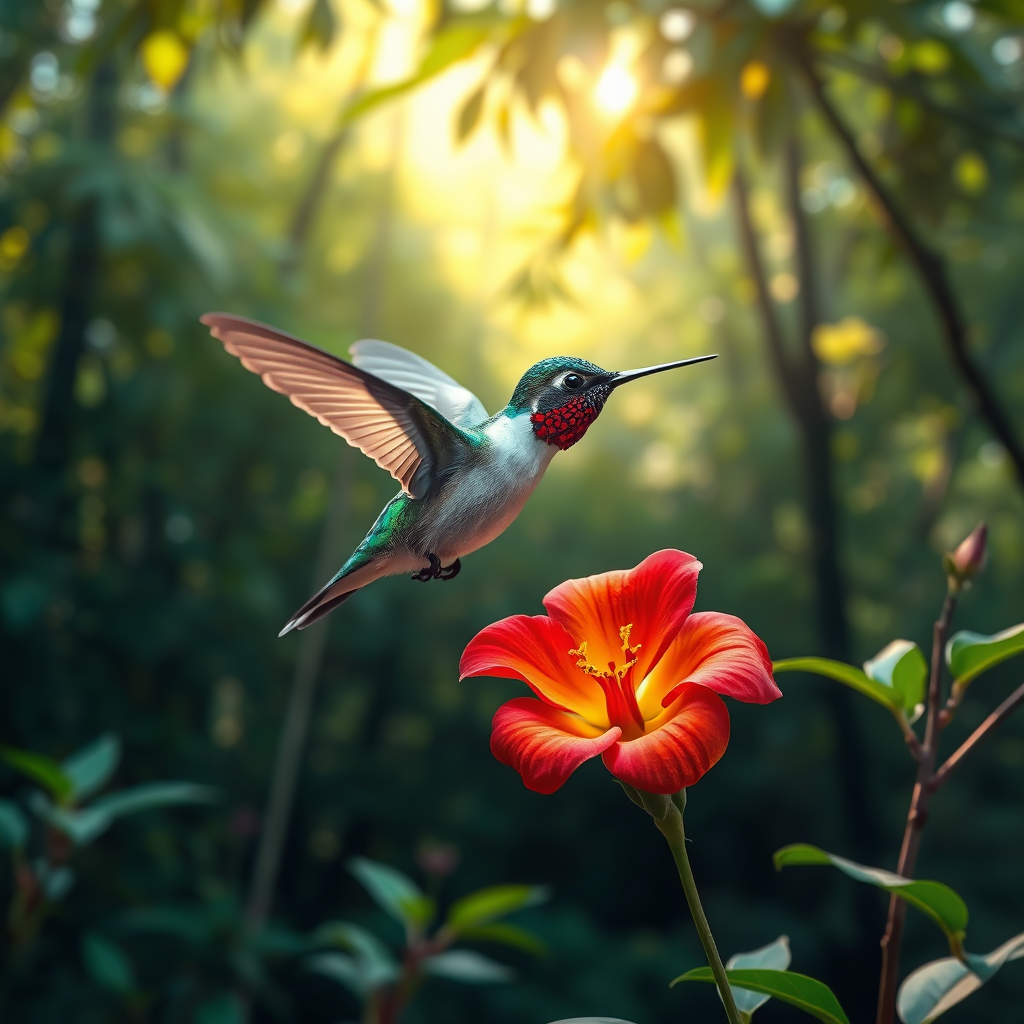 A stunning scene captures a hummingbird hovering gracefully beside a vibrant flower, its wings frozen mid-motion in an elegant and dynamic pose. The side view offers a glimpse of its iridescent plumage shimmering under the gentle rays of natural light filtering through the dense canopy of a lush forest backdrop. This hyper-realistic image showcases incredible detail and accuracy, resembling a masterpiece of wildlife photography, with ultra-high resolution and precision akin to a 32k render.