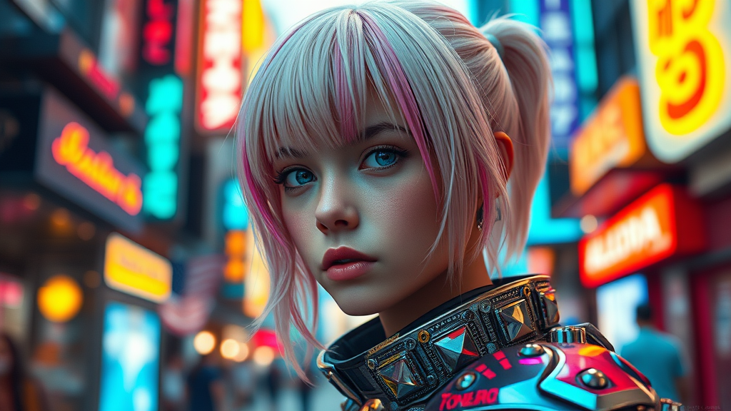 A stunning scene of a girl in a vibrant cyberpunk city, her presence marked by striking half-white, half-pink hair and colorful, intricately designed armor. The city's dramatic lighting casts a cinematic, photorealistic glow, rendered with the precision of Unreal Engine and Octane. The depth of field accentuates the vibrant urban setting, captured in breathtaking 16k UHD HDR quality. Her textured skin and detailed pupils highlight her unique appearance, shot with a cinematic 16mm lens to encapsulate the essence of a candid moment. The bustling street acts as a dynamic backdrop, enhancing the vibrant, futuristic ambiance of the composition.