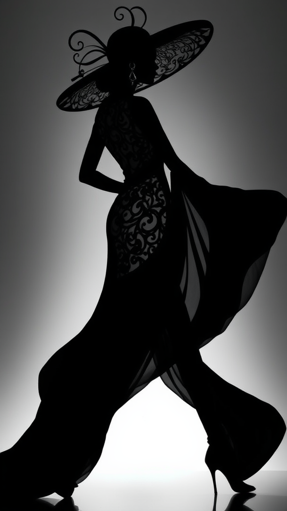 A stunning scene of a woman elegantly dressed in a flowing black gown, wearing an oversized hat tilted to the right, artfully utilizes negative space to captivating effect. The interplay of light and shadow accentuates the crisp lines and intricate forms, creating a mesmerizing and intricate silhouette that exudes beauty and sophistication, with a touch of mystery in its dark elegance.