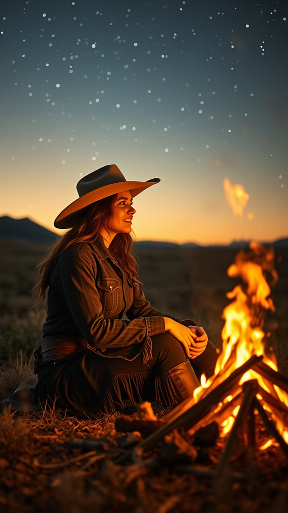 A stunning scene unfolds as a female cowboy gracefully sits by a campfire on the open prairie, encapsulating the spirit of the western frontier. The setting is a breathtaking display of nature's beauty, rendered in comprehensive cinematic detail with ultra-sharp focus. Surrounded by the vast, open borderlands, her features are highlighted in high-quality clarity. The atmosphere exudes an air of rugged elegance, with every detail crafted to perfection. The night sky stretches infinitely above, speckled with stars that twinkle like distant memories. Despite the harsh terrain, a sense of beauty prevails in this serene moment. As she gazes into the flickering flames, the firelight dances across her face, revealing a narrative of resilience and grace. The scene is unmarred by visual distortions, showcasing only the authentic essence of the moment captured in time.