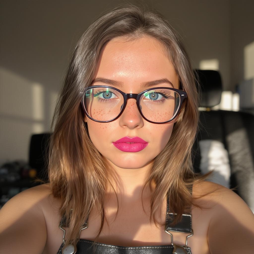 A stunning selfie portrait of a captivating girl with alluring dark blue eyes and sleek brown hair. Her stylish glasses frame her face, while pink lipstick accentuates her perfectly imperfect chapped lips. Her freckled complexion highlights a flawlessly thin nose, enhancing her natural beauty. She is dressed in chic leather overalls, capturing the essence of the early morning light. Shot with a 1.4mm lens, there is a sharp focus on her eyes, subtly modifying the original imperfections for a more refined look.