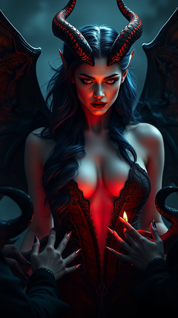 A stunning sensuous woman with alabaster white skin, bold scarlet lipstick, and cascading midnight blue hair, her mesmerizing crimson eyes exuding irresistible charm. She stands as a bewitching queen vampiress, adorned with gleaming jet red horns and six expansive arching wings. Other vampires reverently bow before her in a setting that is dark, grim, and gothic, wrapped in a dense, humid atmosphere. The scene captures an epic, dramatic feel with a hint of eeriness, where every element is hyper-detailed and photorealistic. Her presence is that of a captivating femme fatale in a glamour shot, full of passion and allure. The landscape around her is intricately detailed, crafted with the visual fidelity expected from a hyper-realistic octane render. Soft volumetric lighting and the advanced capabilities of Unreal Engine 5 contribute to a hypermaximalist setting that is incredibly lifelike and immersive.