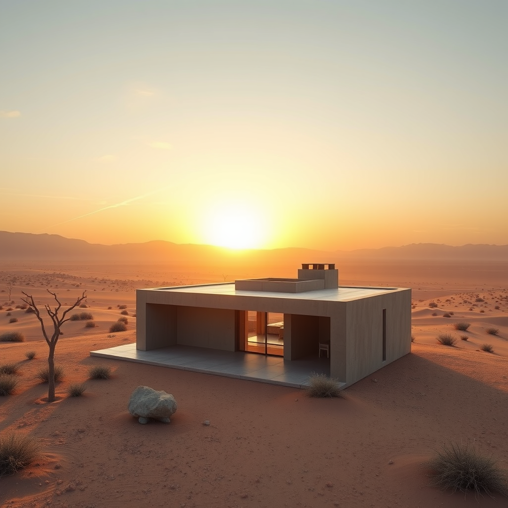 A stunning small modern villa with sleek brown cubic architecture blends Bauhaus and Futuristic styles, set against a breathtaking desert sunrise. Its ash-colored concrete exterior, geometric design, and ultra-detailed structure evoke a hyper-realistic scene captured in an 8K octane-rendered image. The wide-angle camera frames the villa as the centerpiece, providing a cinematic look reminiscent of Jean Leon Gerome and Asher Brown Durand's artistry. With a focus on highly detailed buildings and 3D scanned materials, the villa's cutting-edge design stands out in a bright, realistic style, trending on ArtStation and CGSociety. The scene leverages Unreal Engine's post-processing and de-noise capabilities to enhance its sumptuous aesthetic.
