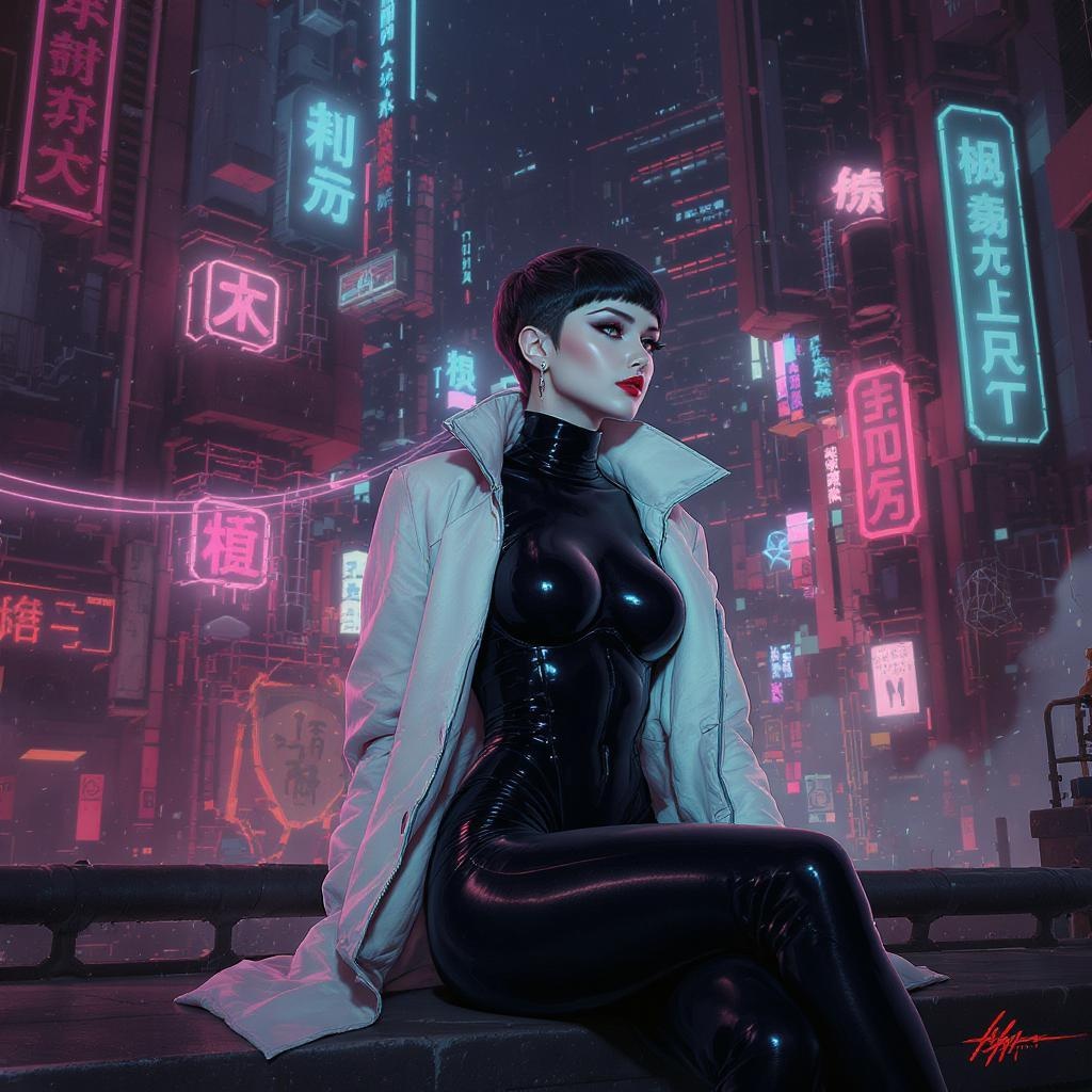 A stunning solo portrait of a girl sitting in a cyberpunk environment, inspired by official art and designed as a unity 8k masterpiece wallpaper. The scene is ultra-detailed, capturing a beautiful and aesthetic vibe with glowing skin and an artful representation of the most beautiful form of chaos. The girl exudes elegance within a brutalist architectural background, filled with vivid colors reminiscent of romanticism. The wide shot features her in a black bodysuit with a distinctive white jacket, her red lips contrasting against her short hair. She is placed at a distance from the lens, enhancing the anime-influenced style of Cyberpunk 2077 with small creative modifications, maintaining a sense of dynamic beauty and depth in a vividly detailed environment.