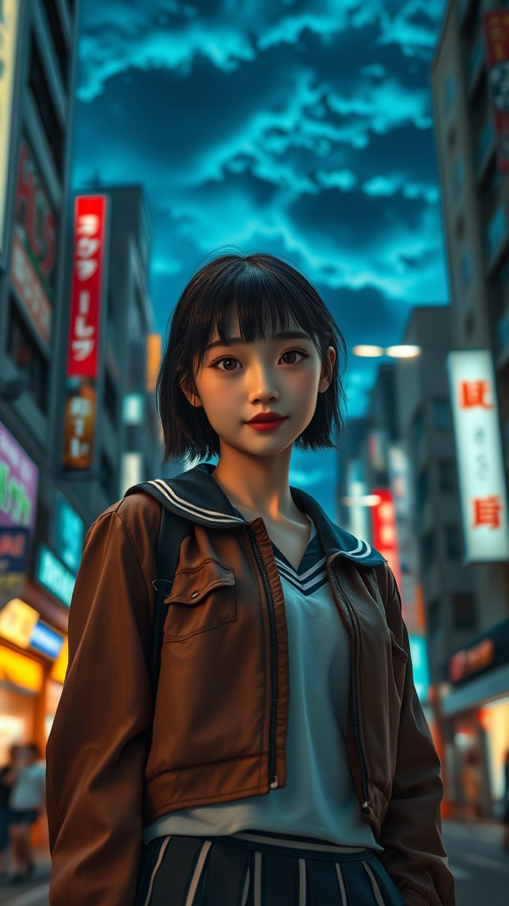 A stunning solo scene of a young woman in a beautiful, detailed Tokyo street at night, framed under a captivating, ultra-detailed sky. She stands in a full-body shot, wearing a short jacket over a school uniform, looking directly at the viewer. Her eyes and lips are exquisitely detailed, capturing a sense of life and emotion. The professional, cinematic lighting enhances the contours of her face, utilizing advanced photon mapping and physically-based rendering techniques to create depth and realism. The environment is rich with texture, from the see-through elements of her clothing to the vibrant city backdrop. Careful attention is paid to her form, ensuring natural proportions and flawlessly drawn hands and feet, avoiding any distortions. The scene avoids any imperfections such as skin blemishes, extraneous body parts, or poorly rendered limbs, maintaining a high level of clarity and quality throughout.