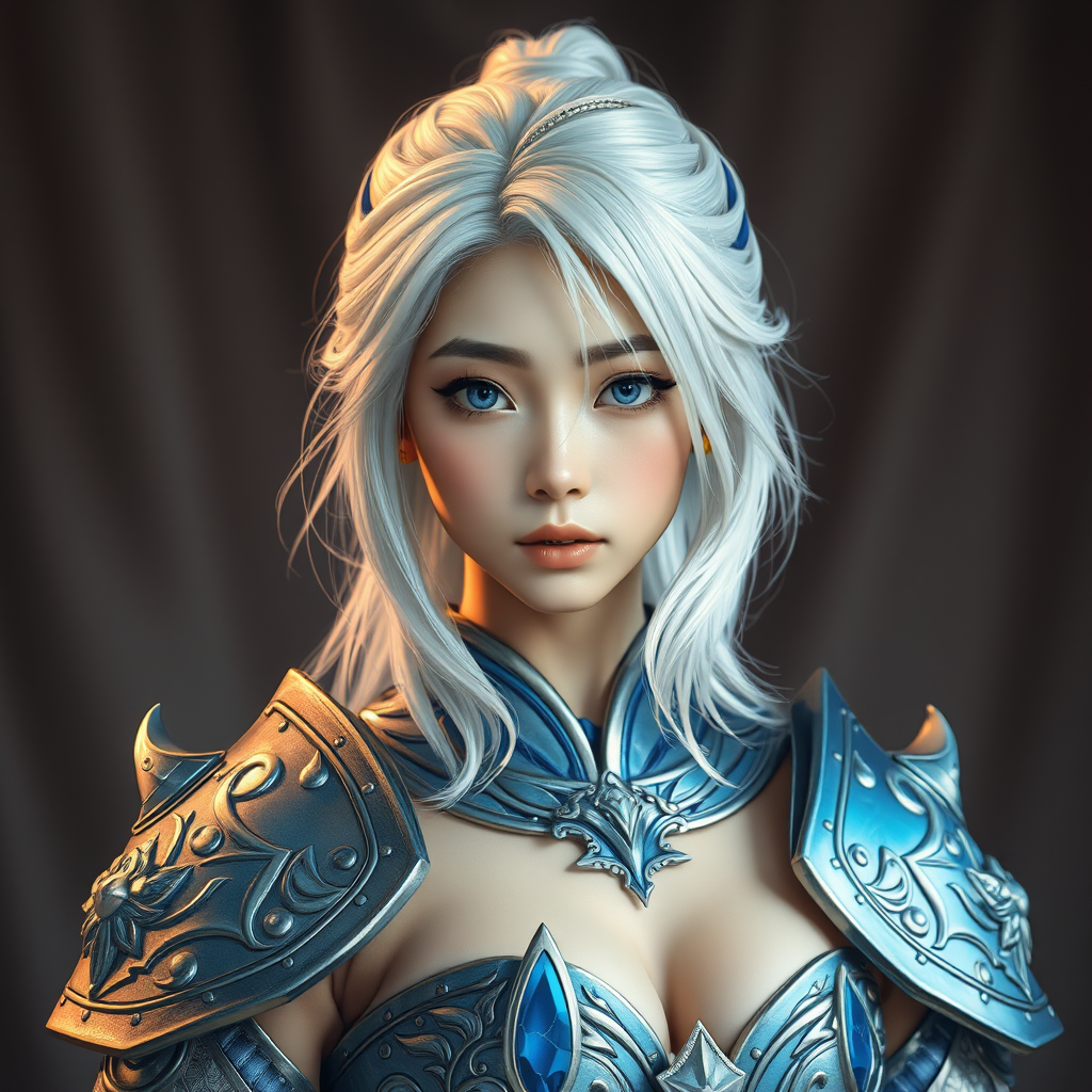 A stunning South Korean girl with medium length white hair and a toned midriff, adorned in intricate azure armor that highlights her beautiful, detailed face. Her hyperrealistic appearance is reminiscent of Greg Rutkowski's style, capturing every nuance in 8k detail, with a hint of ethereal grace and strength radiating from her presence as she stands poised in her elegant armor.