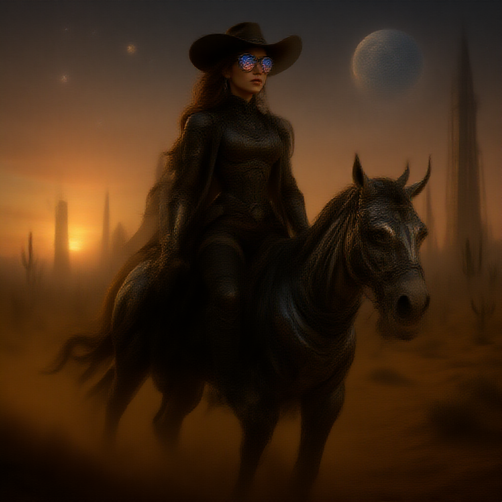 A stunning space cowgirl adorned in futuristic attire, her ensemble shimmering with interstellar hues as she confidently rides a sleek, biomechanical horse across a vast landscape that merges the rugged Wild West with sci-fi elements. Her eyes, reflecting distant galaxies, scan the horizon under the glow of multiple moons. The setting sun casts long shadows over a terrain dotted with both cacti and towering, metallic structures, blending ancient tradition with advanced technology. Her horse, an intricate fusion of natural and synthetic, moves with mechanical grace, its metallic sheen contrasting against the dusty ground. In this ultra-detailed, hyper-realistic scene captured in 8k resolution, the atmosphere crackles with the promise of space-age adventure, evoking an era where the frontier is both terrestrial and celestial.