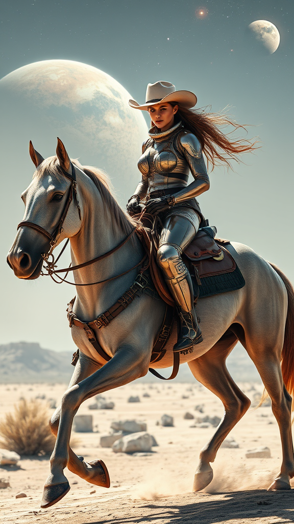 A stunning space cowgirl with an aura of elegance, dressed in a fusion of classic wild west attire and futuristic space-age gear, riding a sleek, biomechanical horse across a mesmerizing landscape. The scene captures the essence of a wild west setting combined with sci-fi elements, with the backdrop featuring distant planets and nebulae in the sky. The cowgirl's outfit glistens with intricate details, reflecting advanced technology, yet hints at rugged frontier spirit. Her expression is one of determination and grace as she confidently maneuvers through this otherworldly terrain. The photograph is ultra-realistic, showcasing every texture and nuance in 8k resolution, emphasizing the harmonious blend of past and future in a breathtaking 9:16 composition.