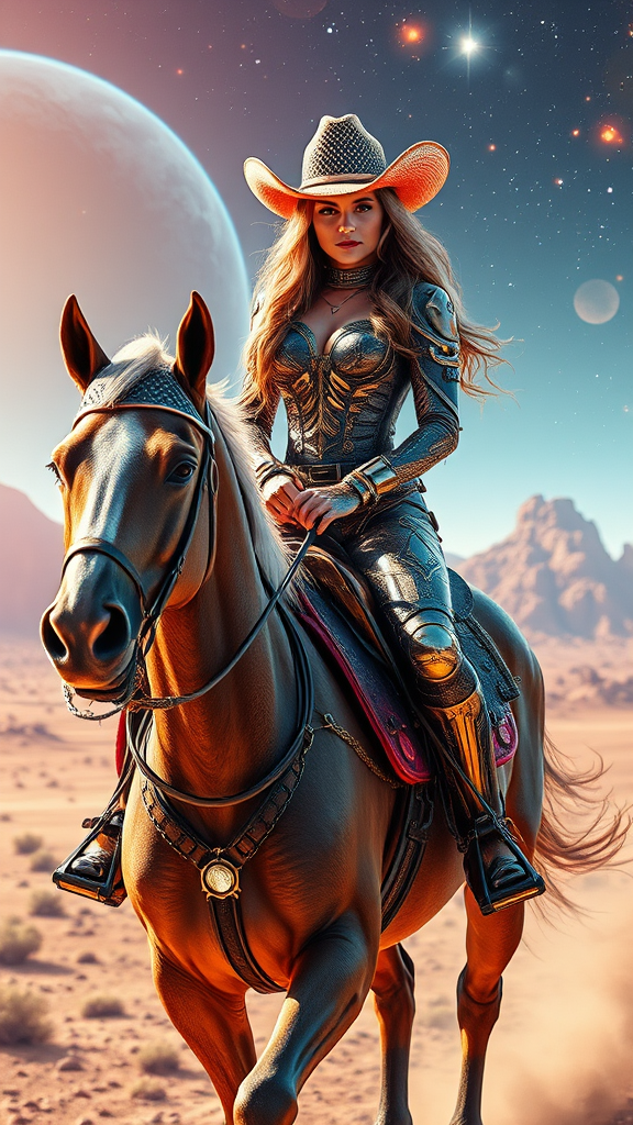 A stunning space cowgirl with shimmering cosmic attire, her intricate outfit blending the rugged charm of the Wild West with sleek, futuristic elements, rides a majestic cyber-enhanced horse across a mesmerizing extraterrestrial landscape. The scene bursts with vibrant colors and stellar backdrops, captured in ultra-detailed, realistic photography. Her confident gaze reflects the spirit of adventure and resilience as she navigates the untamed frontiers of a space age era. The atmosphere combines the nostalgia of the Old West with cutting-edge sci-fi aesthetics, captured in breathtaking 8k resolution.
