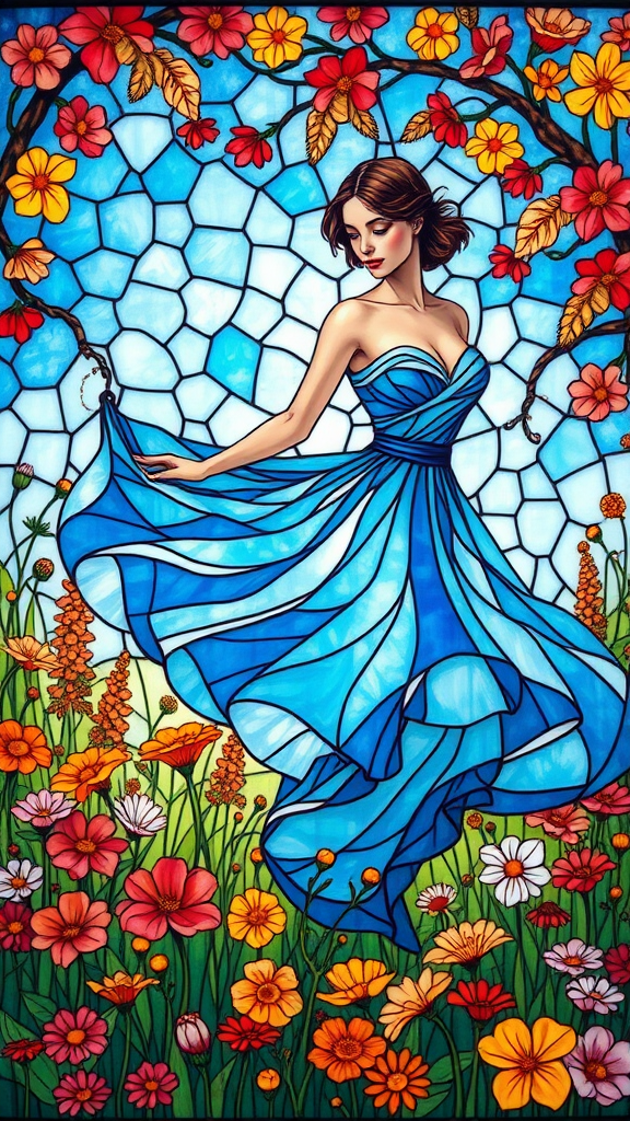 A stunning stained glass creation depicts a woman with elegant short hair twirling gracefully in a lush meadow filled with blossoming flowers. She wears an exquisite blue dress that flows like water around her, weaving through the multitude of vibrant floral hues. The piece radiates with a rich blue motif and intricate details, each panel capturing the essence of light streaming through colored glass, producing an enchanting glow. It is a breathtaking masterpiece, the kind that makes one marvel at its sheer beauty—a cinematic vision rendered in sharp focus, enriched with a delicate, whimsical style that enchants the observer.