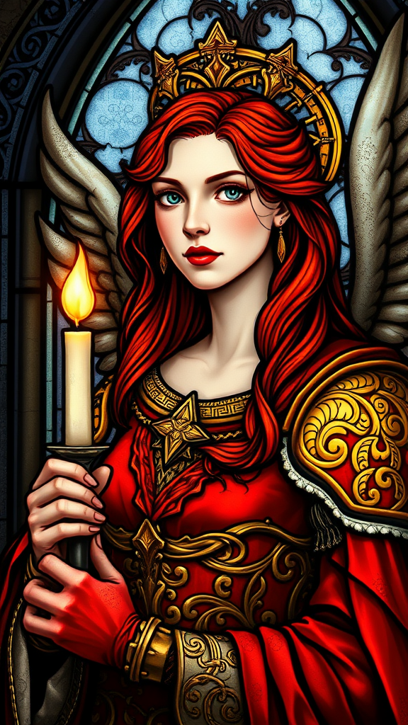 A stunning stained glass depiction of a regal redheaded queen adorned in angelic golden armor holding a glowing candle, the piece exudes art nouveau elegance with rich Celtic influences. Her vibrant red armor contrasts beautifully with intricate gold detailing, and her striking portrait is portrayed in ultra-high-definition, capturing every exquisite detail with high saturation. The entire artwork radiates with vivid colors and meticulous craftsmanship, embodying a harmonious blend of medieval and ethereal aesthetics.