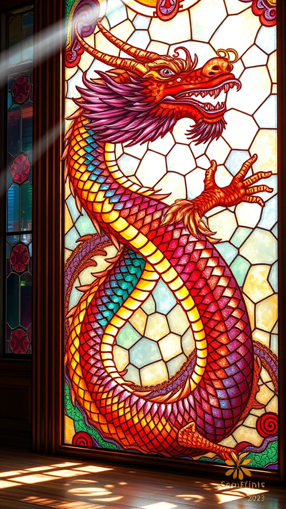 A stunning stained glass masterpiece depicting a majestic Chinese dragon, imbued with vibrant colors and grace. Sunlight streams through the window, casting a kaleidoscope of hues across the room. The dragon is captured in a dynamic, flowing pose, its intricate scales shimmering with an ethereal glow. This elegant and highly detailed digital painting is rendered in ultra-high 8k resolution, showcasing every meticulous line and curve with sharp cinematic focus, resulting in an awe-inspiring visual experience.