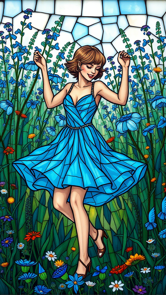 A stunning stained glass masterpiece depicting a woman with a pixie cut dancing joyfully in a lush field of wildflowers, predominantly adorned with shades of blue. She wears an enchanting azure dress that sways with her movements. The intricate details of the portrait are mesmerizing, with each piece of glass capturing light and color in a way that feels magical. The floral background is vibrant and full of life, creating a cinematic and breathtaking scene. The sharp focus and playful style imbue a sense of wonder and delight, making it unbelievable in its beauty, like a scene from a dream.
