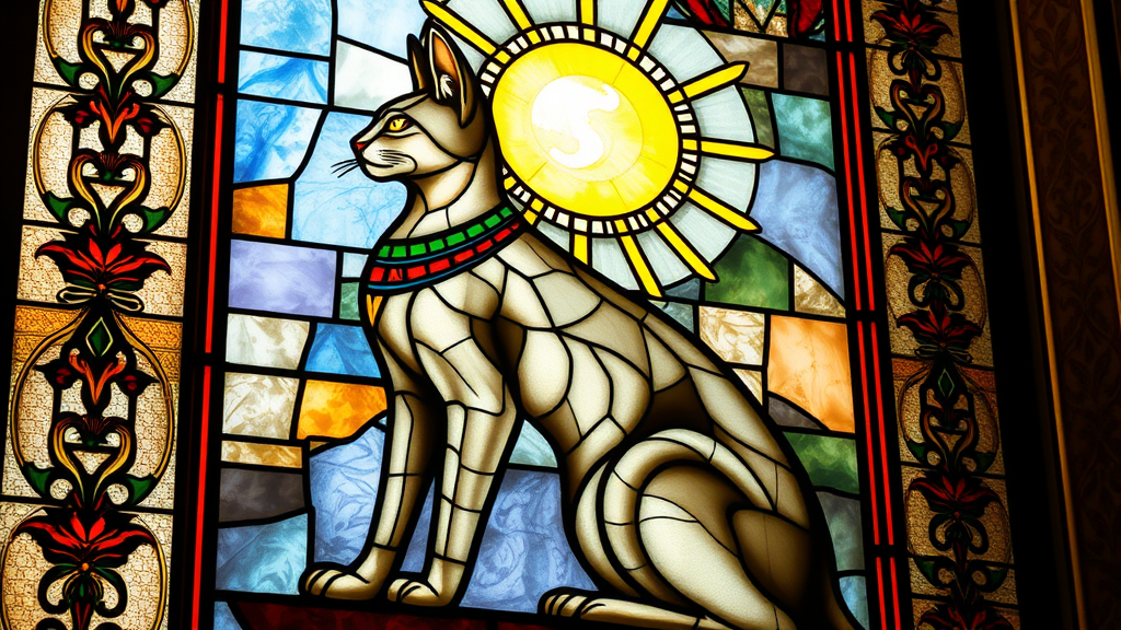 A stunning stained glass window features an elegant Egyptian cat, its sleek body poised in a graceful side profile, with the sun brilliantly positioned behind its head, casting a radiant halo. The window showcases exquisite, high-definition details, with intricate patterns accentuating the cat's regal form. Soft, diffused lighting highlights its dignified posture, while vivid colors dance through the glass, reflecting onto the surrounding walls. The extreme focus reveals every meticulous detail in the design, capturing the essence of majesty and elegance, as light filters through, adding a warm, celestial glow to the serene scene.