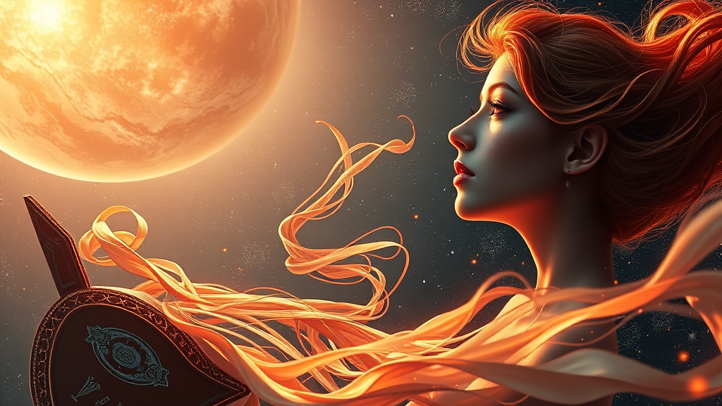 A stunning surreal airbrushed artwork depicting dopamine streaming from the planet Venus, flowing gracefully through the vastness of space and into a beautiful young redheaded warrior. Rendered in Unreal Engine with an 8K resolution, this piece embraces CGI and concept art aesthetics, reflecting the trending styles on CGSociety and ArtStation. Capturing the essence of a Dutch golden hour, the scene is bathed in dreamlike ambient lighting. The ethereal beauty of the warrior is accentuated by intricate detailing reminiscent of Ilya Kuvshinov, Artgerm, Alphonse Mucha, and Greg Rutkowski. This work of art, full of movement and emotion, feels both otherworldly and deeply personal. The addition of twinkling stars and swirling cosmic winds only enhances the dreamlike quality of the scene.