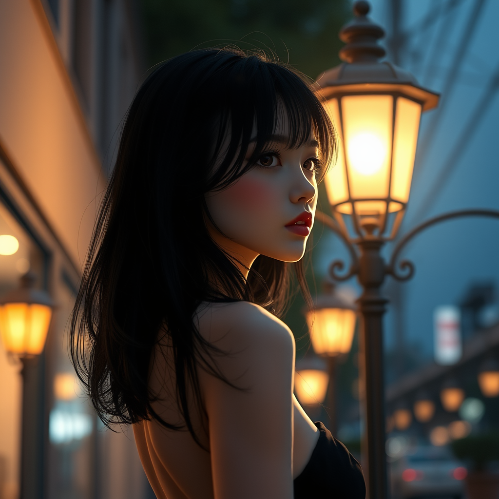 A stunning tall girl with long black hair, standing elegantly under a softly glowing lamppost, captured in an Anime Glamor Shot. The scene is enhanced with cinematic dramatic lighting, creating a hyper-realistic and photorealistic atmosphere. The detailed rendering captures her slender figure and beautiful face with highly intricate details. There's an elegant interplay of light and shadow, brought to life by volumetric lighting, reminiscent of an octane render. The image possesses a dreamy 150mm lens effect, free from any anomalies. The surrounding environment is artistically blurred, keeping the focus solely on her striking presence.