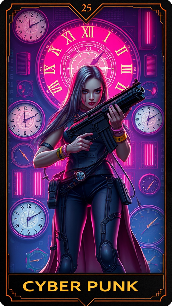 A stunning tarot card featuring a cyberpunk-inspired portrait of a woman armed with a futuristic firearm. She stands surrounded by intricate, neon-lit clocks and advanced cyberpunk technology. The scene is set in a vibrant science fiction universe, echoing the style of Cyberpunk 2077. The image is cinematic and breathtaking, featuring intricate and vivid details. The backdrop glows with neon lights, casting dramatic shadows in a chiaroscuro effect. The artwork is reminiscent of anime-style key visuals, showcasing both high-definition quality and dynamic energy. The composition is vivid and rich in color, offering a mesmerizing visual experience that captures the essence of a futuristic world.