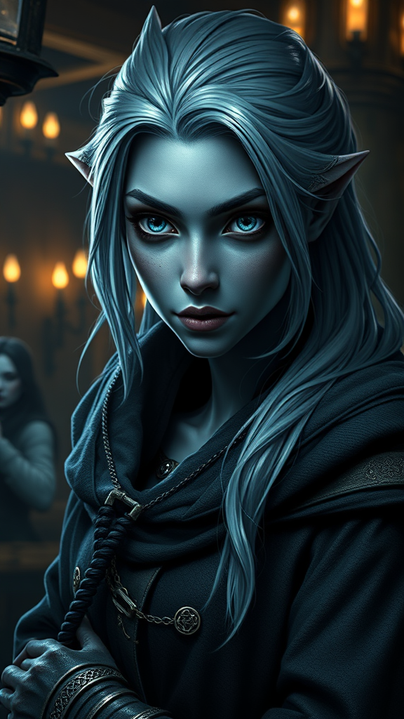 A stunning thief from the D&D Circle of Stars, exhibiting captivating eyes and a full-body presence, dark fantasy, with a detailed realistic face. This digital portrait captures a beautiful female Drow with gray skin in a Medieval Tavern setting. The environment is imbued with moody and dramatic lighting, contributing to the scene's atmospheric tension. Rendered in 8k UHD HDR quality, inspired by Model: jim EIDOMODE. Creative elements include an otherworldly yet graceful appearance, avoiding duplicated or distorted features to maintain realism. The composition excludes low resolution, blur, artifacts, or distractions, focusing on the character's elegance and mystique.