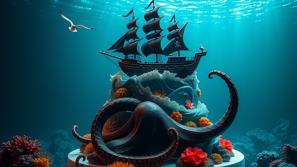 A stunning three-tiered cake set in a fantastical underwater universe features a meticulously detailed black pirate ship sailing atop whipped waves, guarded by glistening seagulls. Below, an imposing Kraken unfurls its majestic tentacles amidst vibrant coral reefs, enveloping the cake’s base. The scene is illuminated by dramatic, diffused lighting that casts enchanting reflections across the water, creating an atmosphere of wonder and mystery. Hyperrealistic textures, intricate designs, and exquisite attention to detail are brought to life with cutting-edge technology, capturing every nuance in breathtaking 8k resolution with a cinematic depth of field, evoking a spectacular diorama reminiscent of an Unreal Engine creation.