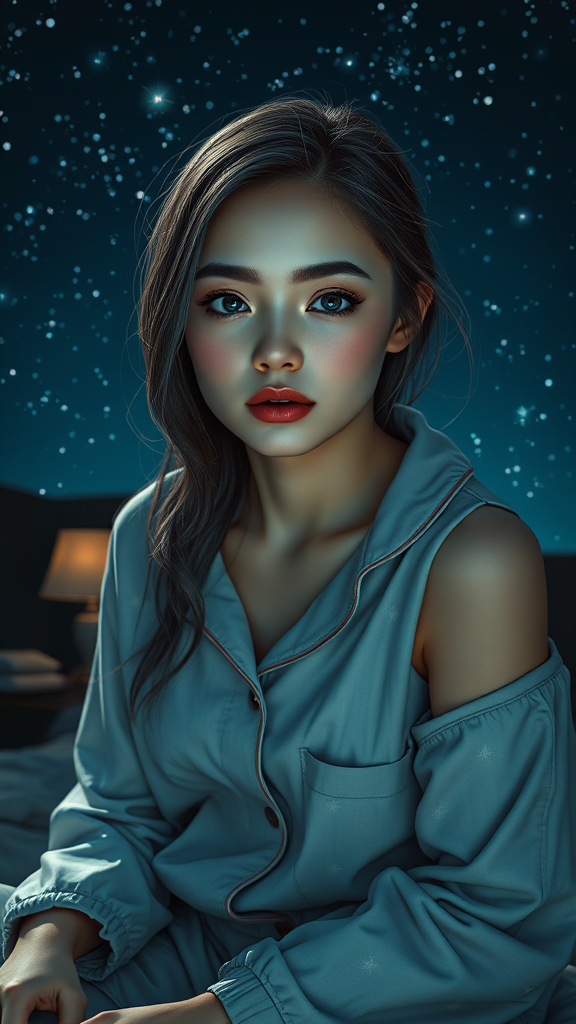 A stunning, ultra-detailed full-body art piece showing a solitary girl in pyjamas, her beauty captured under a starry night sky. The setting is a meticulously detailed bedroom with a cinematic ambiance. Her eyes and lips are exquisitely detailed, reflecting a professional use of lighting and advanced rendering techniques such as photon mapping and radiosity. Her gaze draws the viewer in, with a natural light highlighting her face. Despite being outdoors, the environment feels intimate and serene. Avoiding imperfections, her skin is flawless, and her form is rendered harmoniously, with seamlessly integrated limbs and features. The composition is free of any distracting elements like signatures, watermarks, or other artifacts.