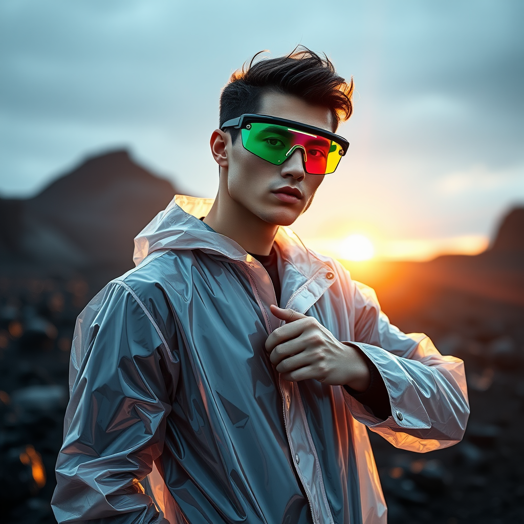 A stunning ultra high definition portrait photograph of a male model striking a confident pose in a transparent pearlescent raincoat, accessorized with a vibrant neon visor. The scene is set against the dramatic backdrop of an Icelandic black rock landscape at the break of dawn. The photograph showcases intricate details, capturing the interplay of light and shadow with breathtaking clarity. The shallow depth of field emphasizes the model, while volumetric lighting and expert ray tracing create mesmerizing light rays. The environment is stark and captivating, accentuating the unique textures of the volcanic rocks with the dawn's soft glow. This image evokes a sense of surreal elegance and avant-garde fashion in the untamed beauty of Iceland's natural landscape.