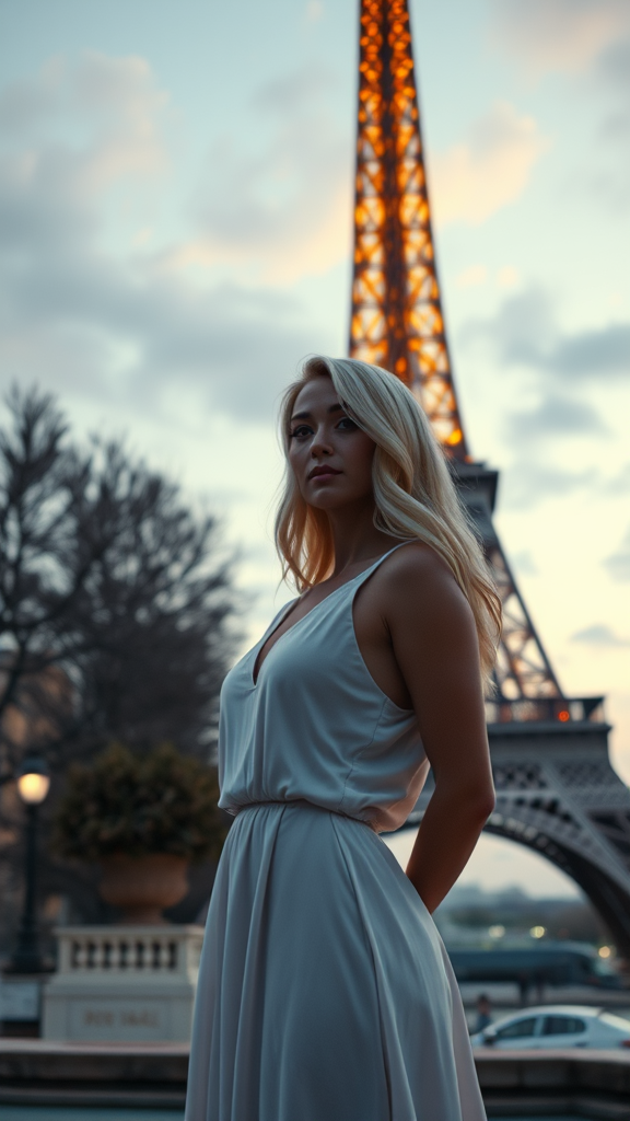 A stunning ultra realistic 4k depiction of a mesmerizing blonde woman standing gracefully in front of the iconic Eiffel Tower, rendered with hyper-realistic precision in Unreal Engine 5, showcasing cinematic qualities and extreme attention to detail, capturing the essence of a serene Parisian evening with breathtaking artistry.