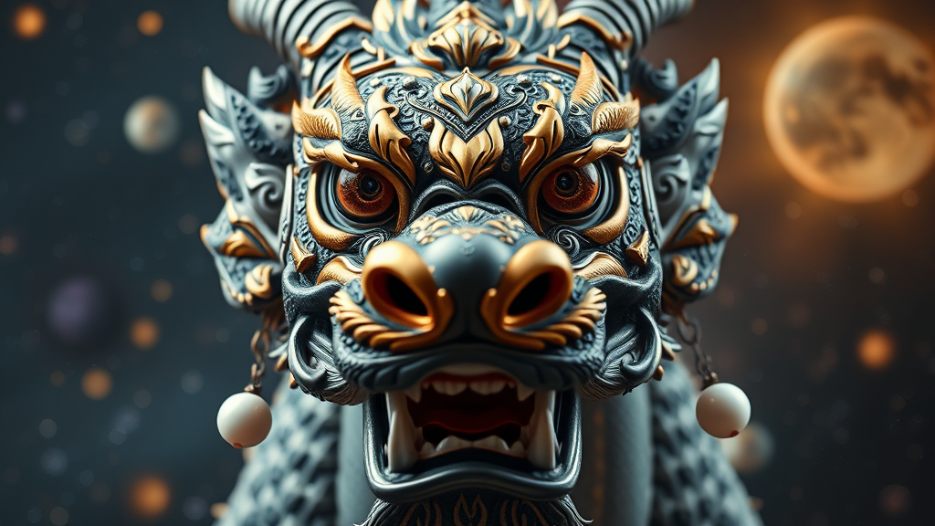 A stunning ultra-realistic close-up image of a fierce Singha facing forward, showcasing intricate and hyper-detailed features. This composition integrates mythical Thai elements and dragoncore aesthetics, adorned with a delicate pearl earring. The scene embodies magic realism, set against a galactic background with a mesmerizing interplay of epic lighting. Captured in breathtaking 32k UHD resolution using a Hasselblad H6D-400c Multi-shot and Mitakon Speedmaster 65mm f/1.4 XCD lens, the image maintains its mythological essence with a touch of the fantastical, enhancing the viewer's experience with its meticulous detail and captivating atmosphere.
