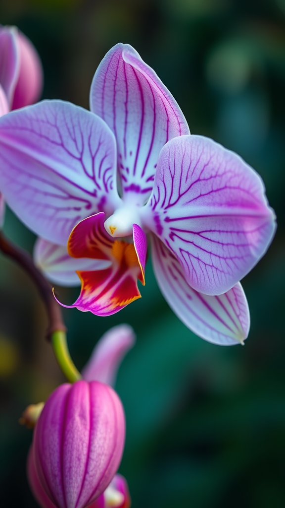A stunning ultra-realistic close-up of an exotic orchid, with delicate petals and intricate patterns, captured in the style of high-definition nature photography. Shot using a Sony A7 III, the image emphasizes vivid colors and striking contrasts, set against a blurred natural background. The tall aspect ratio accentuates the orchid's elegant form, while the stylized elements add a touch of artistic flair to the overall composition.