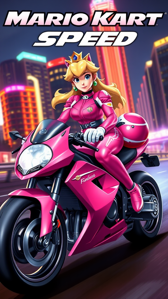 A stunning ultra-realistic illustration of Princess Peach riding a sleek pink Mario Kart-style racing bike, inspired by the Fast and Furious aesthetic. She wears a stylish pink sports suit with white accents, and holds a matching helmet in her right hand. The backdrop is a nighttime cityscape illuminated by neon lights, creating a dark, fantasy vibe. The title "Mario Kart SPEED" is boldly displayed at the top, adding a cinematic touch. This high-resolution artwork, combined with striking typography, offers an unforgettable visual experience, featuring a balanced composition and realistic anatomy.
