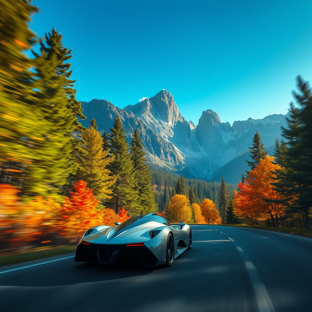 A stunning ultra-realistic image of a futuristic hypercar speeding down a winding forest road, with towering mountains majestically rising in the background, under a clear blue sky. The car's sleek, aerodynamic design reflects the dappled sunlight filtering through the dense canopy of vibrant green trees. The road is lined with autumn foliage, displaying a vivid range of reds, oranges, and yellows. The entire scene is captured in exquisite detail, showcasing the crystal-clear textures and colors in 8K resolution, with high dynamic range and ultra-high-definition clarity.