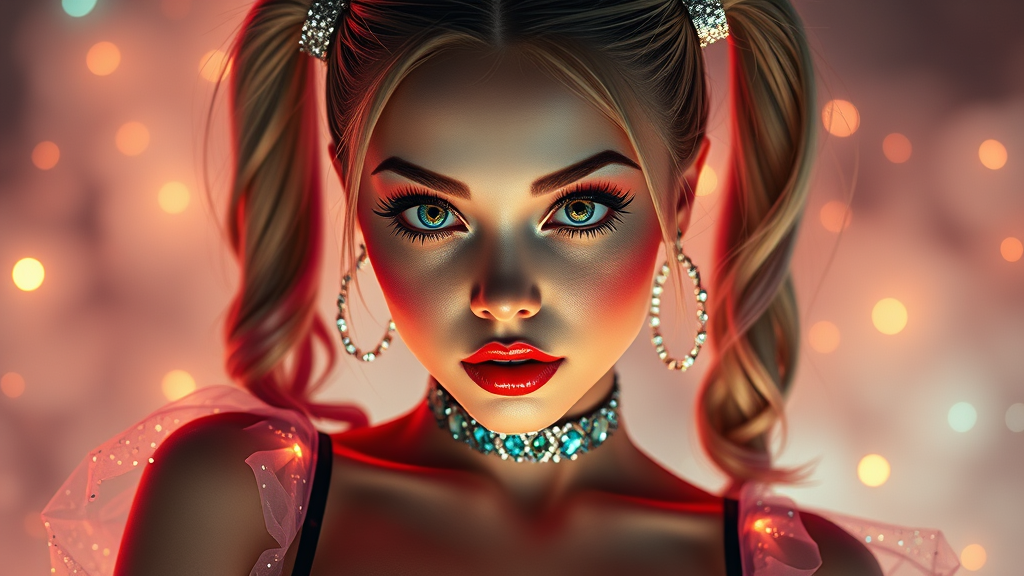 A stunning, ultra-realistic portrayal of a girl inspired by Harley Quinn, featuring a photorealistic face with large, expressive eyes reminiscent of manga style. She wears a sparkly, sheer outfit complemented by a translucent, glowing mini skirt, and her soft makeup accentuates her detailed facial features. Her hair is styled in double ponytails, adorned with glowing accessories. The scene is enveloped in cinematic fog and set against a dreamy background with crystal lighting, creating a whimsical atmosphere. She strikes a seductive pose, her glossy lips catching the light, while volumetric lighting enhances the fairycore aesthetic. The overall composition is rendered in vivid UHD and 8k, radiating a pastel glow that adds to the enchanting and magical feel.