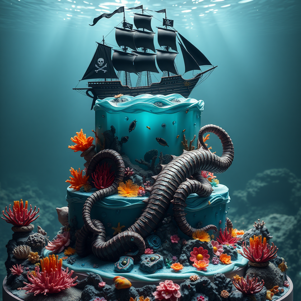 A stunning underwater diorama featuring a three-layered cake design, crowned with a majestically detailed black pirate ship navigating the topmost layer, while the bottom layer showcases the monstrous Kraken emerging with its tentacles wrapping around the layers. Each layer is intricately decorated to represent an artistically designed ocean universe, with vibrant marine life and corals. The dramatic lighting enhances the hyperrealistic and photorealistic elements, creating depth and immersion. Crafted using unreal engine, the scene is captured in breathtaking 8k resolution, offering a cinematic depth of field and pristine detail, set in an elongated 9:16 aspect ratio.