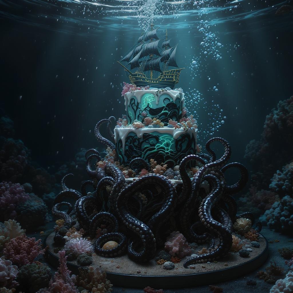 A stunning underwater diorama featuring a three-layered cake design, crowned with a meticulously detailed black pirate ship at the apex. Beneath, the depths reveal a monstrous Kraken, intricately intertwined around the base, all enveloped in an artistically crafted and visually striking universe. The scene is rendered in dramatic lighting that highlights the hyperrealistic textures and photorealistic elements, with a keen depth of field that draws focus to each intricate detail. Created using Unreal Engine, the diorama bursts with an 8K resolution, offering an immersive and breathtaking depiction, while subtle creative enhancements ensure a unique and captivating presentation within a 9:16 aspect ratio.