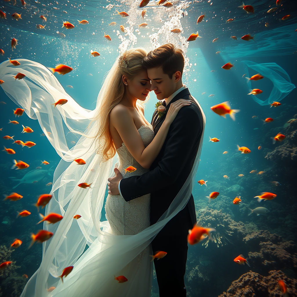 A stunning underwater portrait captures a mermaid bride tenderly holding her groom amidst a dazzling array of colorful marine life. Her luxurious flowing hair drapes elegantly around her, as a flurry of small goldfish flits about, adding to the enchanting scene. The soft shimmer of light barely penetrates through the water, casting a magical glow over the couple. The underwater wedding ceremony is set against an intricate backdrop of coral reefs and exotic sea creatures, creating an ethereal atmosphere. Shot in 35mm with an aperture of F/2.8, the cinematic lighting enhances the scene's exquisite details, featuring a subtle vignette and a warm spotlight. The image is captured in ultra-high-definition 4k, showcasing a sophisticated, ornate composition that is both elegant and breathtakingly detailed.